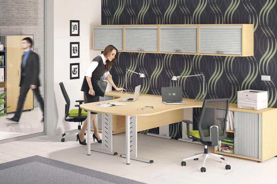 Stosując dodatkowe łączniki i dostawki, istnieje możliwość zestawiania kilku biurek w różnych konfiguracjach.